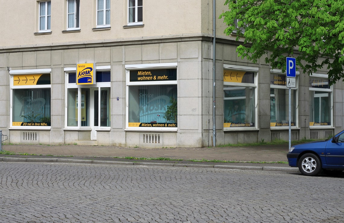 Komplettbeschilderung der LWB Service Kioske an 20 Standorten im Raum Leipzig inkl. Herstellung, Beschriftung und Montage sämtlicher (den Mietobjekten angepasster) Leuchtausleger und -transparente, Werbeflächen und -stelen, Direktbeklebungen