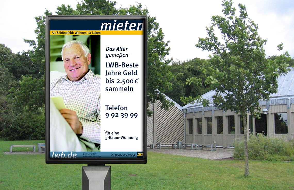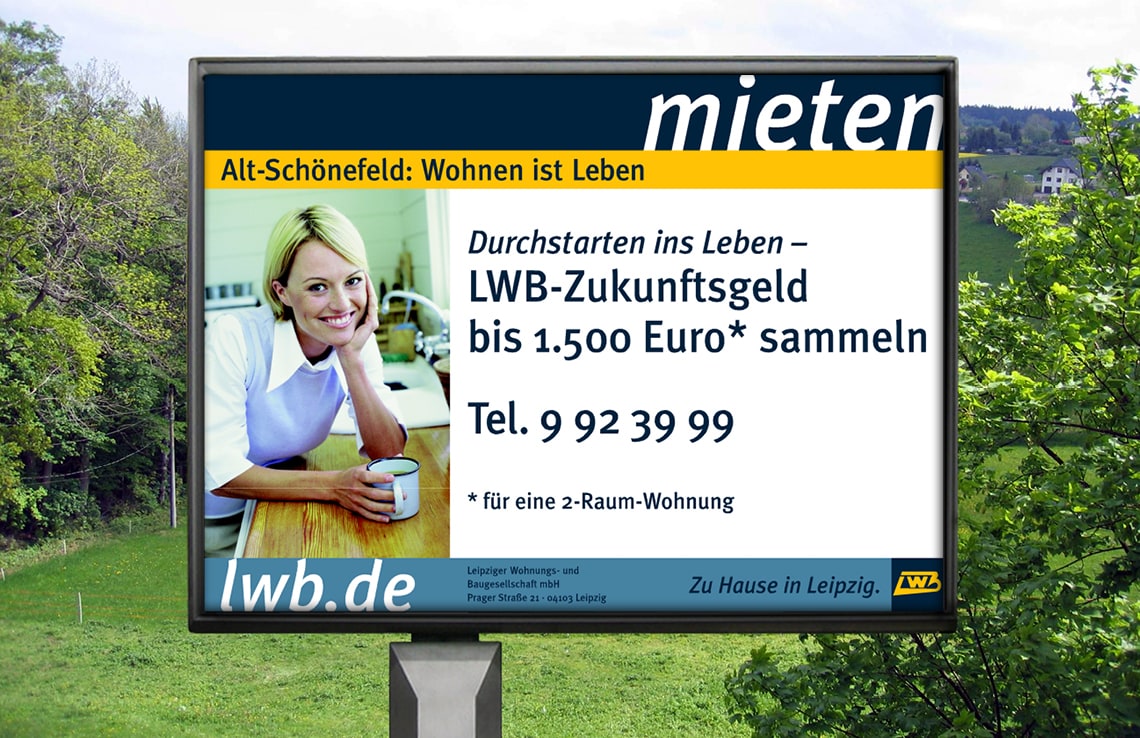 Konzeption der Werbekampagne „Wohnen ist Leben“ zur Vermarktung eines Wohnraumkomplexes in Alt-Schönefeld für drei Zielgruppen; Gestaltung, Produktion und Schaltung von 18/1 Plakatwänden, City Lights, Broschüren, Flyern und Printanzeigen, Verteilung sowie Postwurfsendung der Flyer im Zielgruppenumfeld