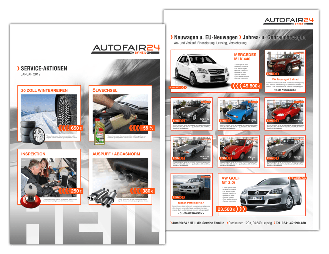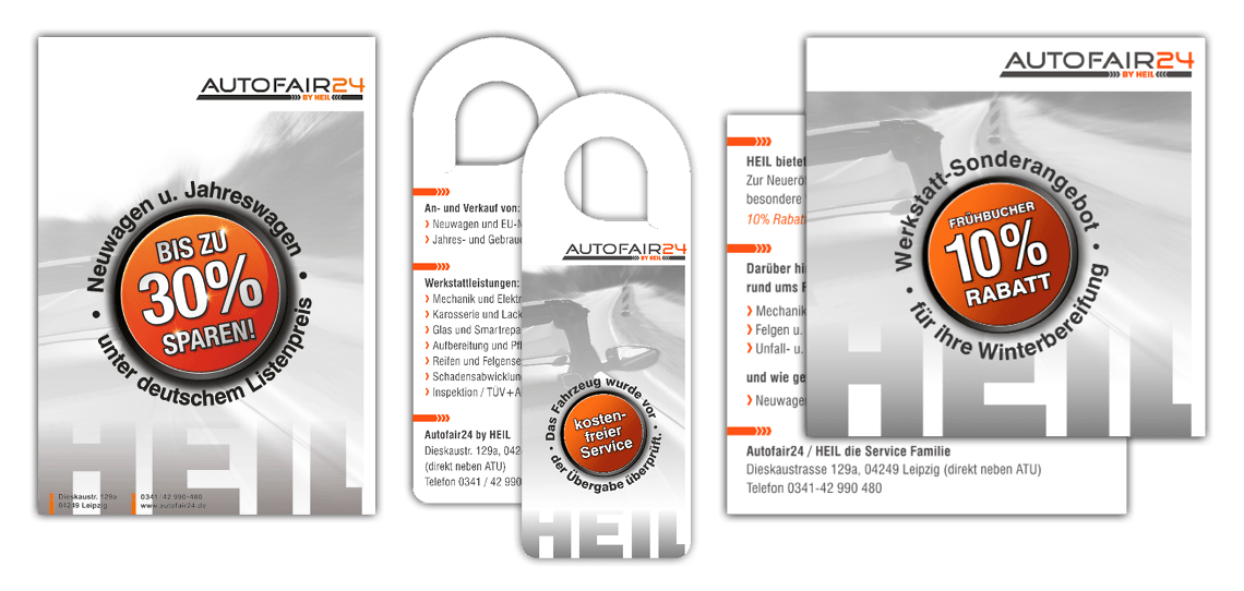 Wagler Marketing betreute das Tradtionsunternehmen HEIL mit verschiedensten Medien- und Reklameproduktionen. Nach Gründung der neuen Handelsmarke "Autofair24" wurden wir beauftragt, in das bereits bestehende Autofair24 Logo das ursprüngliche Logo "HEIL" mit einzuarbeiten, um wieder vom Bekanntheitsgrad der alten Marke profitieren zu können. Wir entwickelten unter dieser Maßgabe ein neues Corporate Design und realisierten verschiedenste Kommunikationsmedien und Reklame-Elemente.