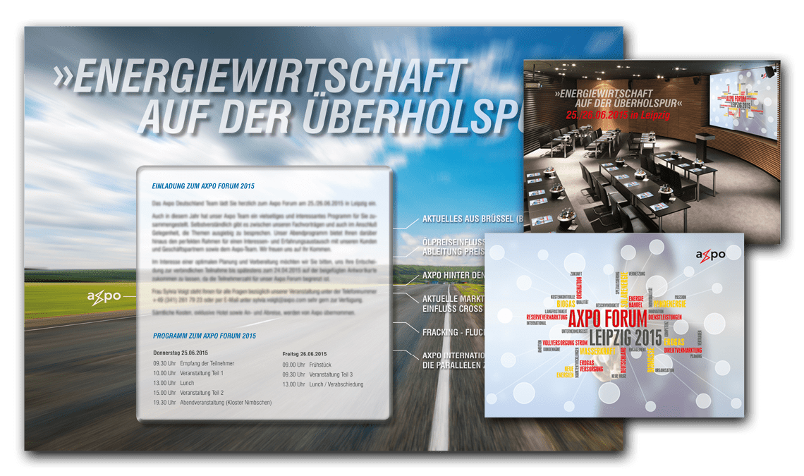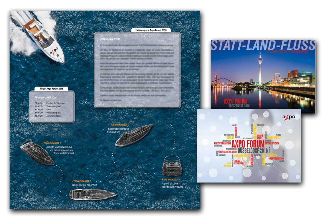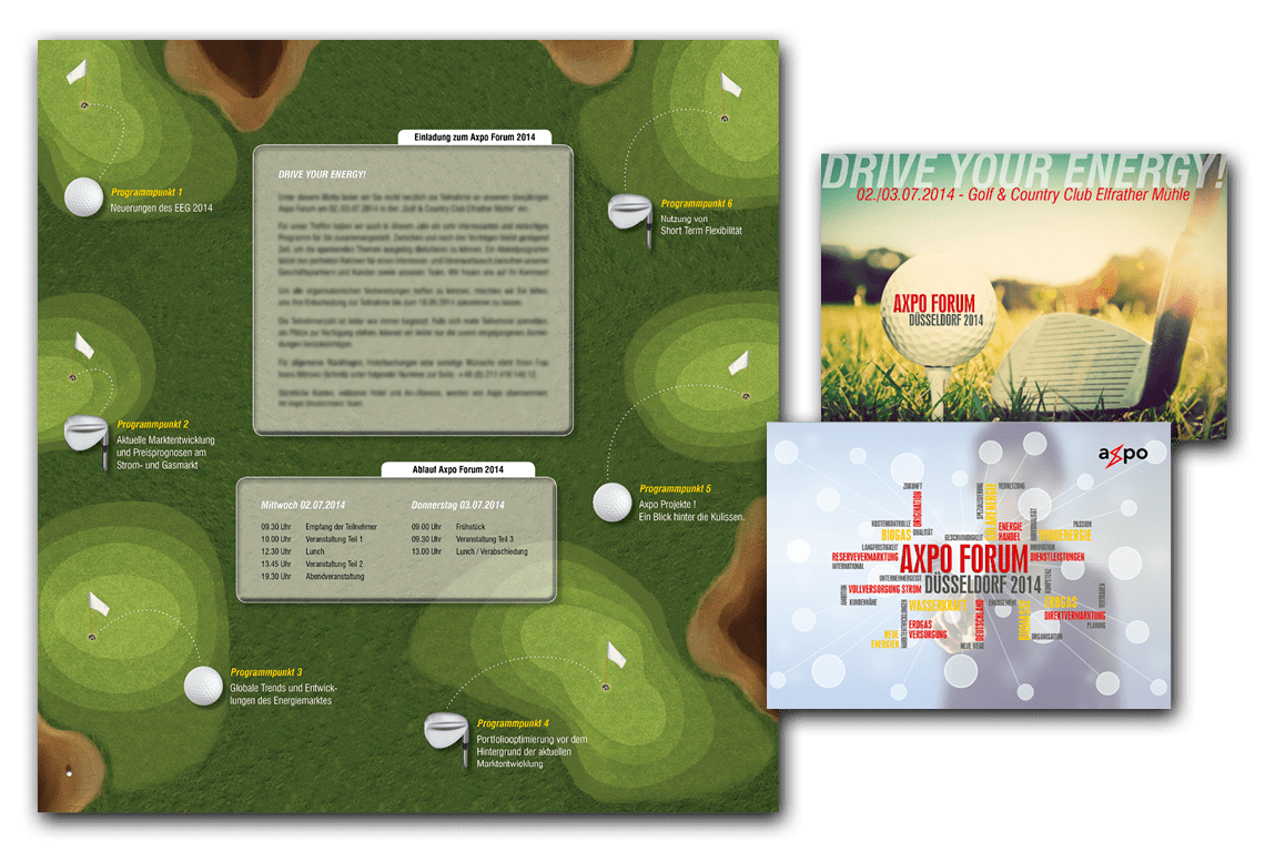 Für das jährlich stattfindende Kundenevent "Axpo Forum" entwickelten wir eine eigene Logomarke und begleiten die Veranstaltungen z.B. mit individuellen Einladungs-Postmailings in denen die geplanten Unterhaltungs-Highlights (Golfpark, Rennstrecke, Speedboot) direkt ins Layout einfließen.