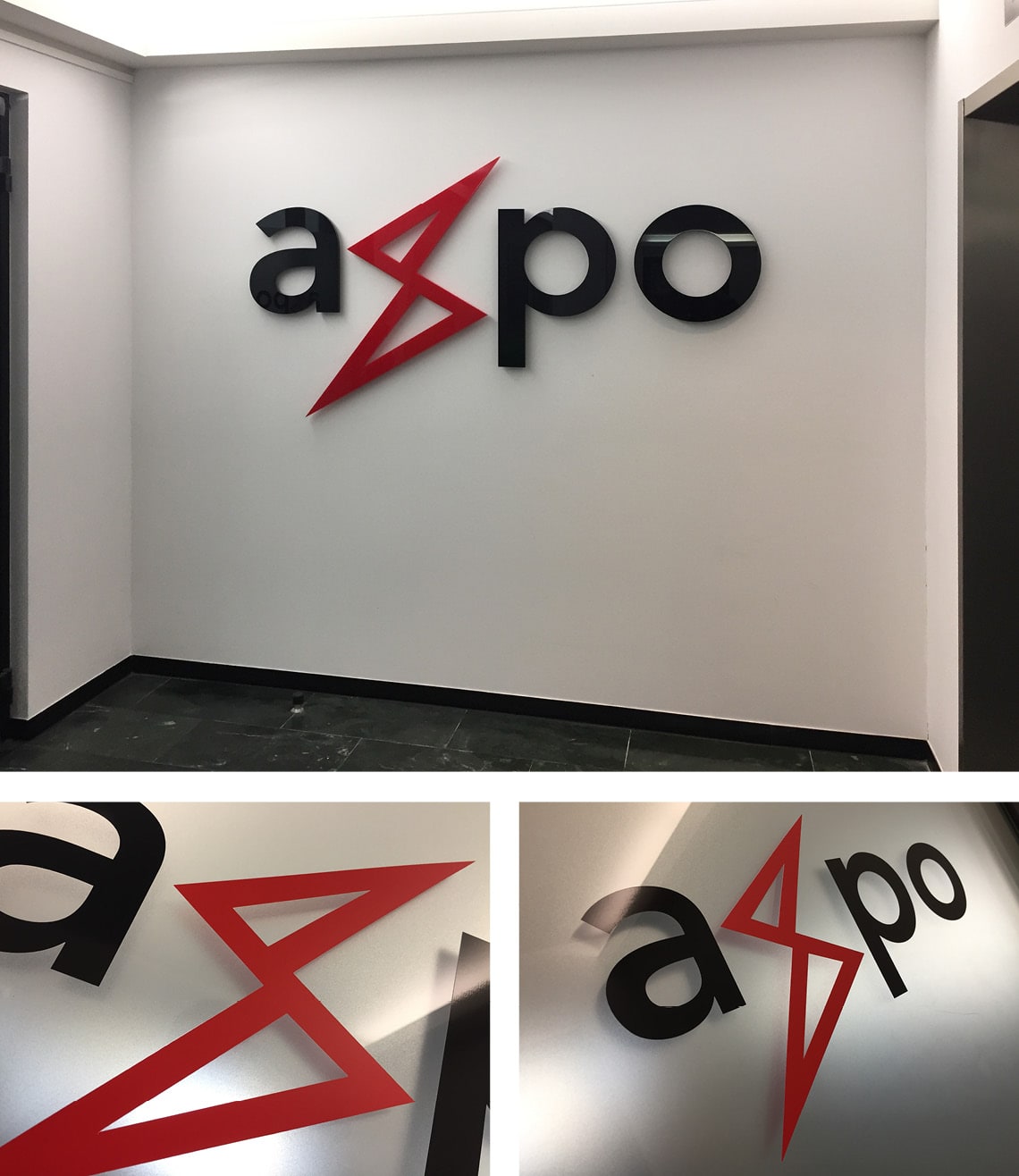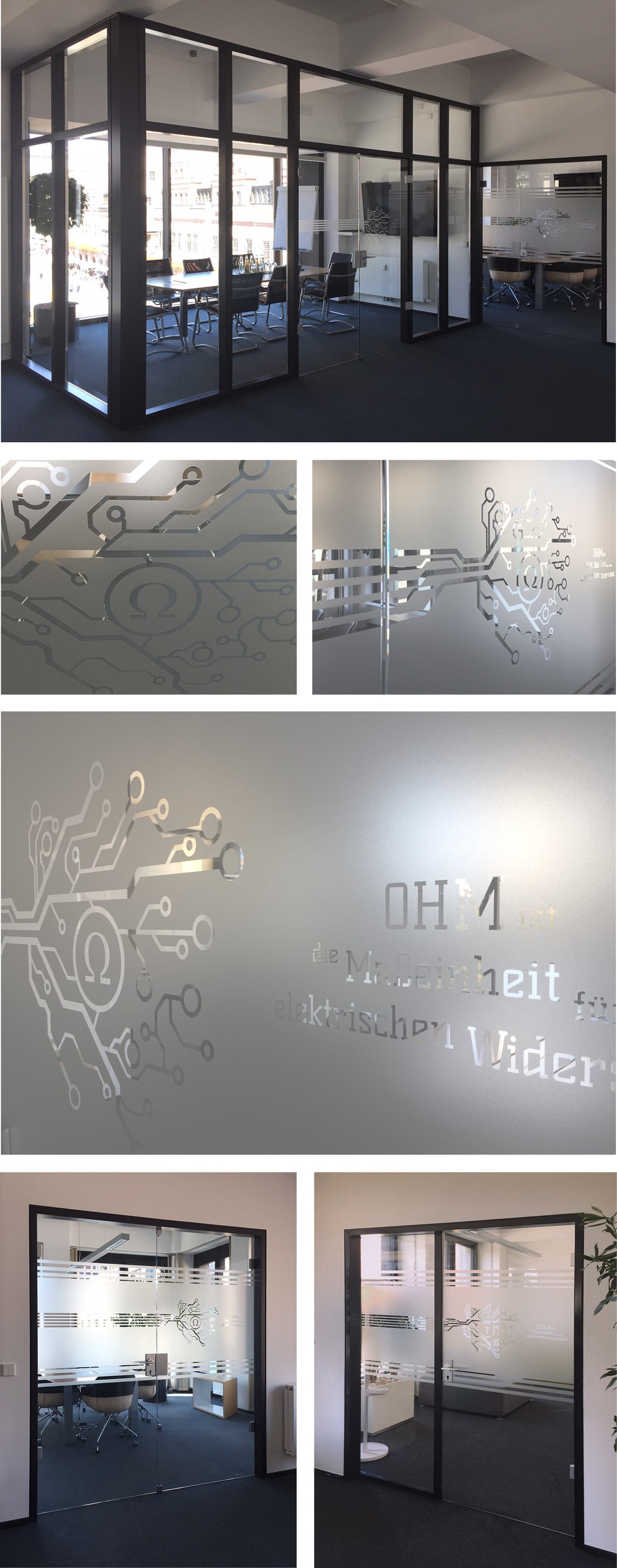 Zur Außendekoration und als Blickschutz gestalteten wir für die Konferenzräume der Axpo eine Energiemotivserie (Watt, Ampere, Ohm, Tesla), die in Glasdekorfolie als Direktbeschriftung auf Glas ausgeführt wurden.
