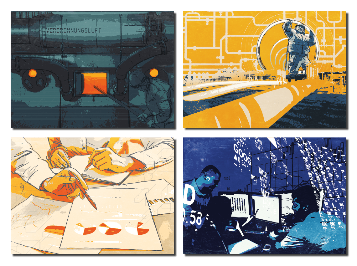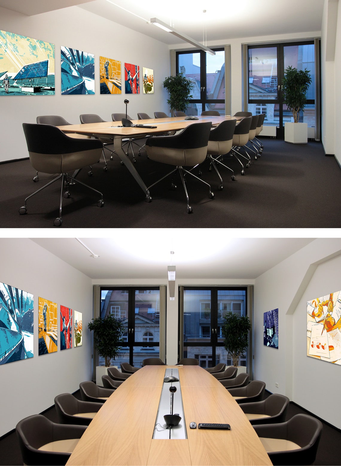 Zur Dekoration der Axpo-Konferenzräume entwickelten wir zu den Kernkompetenzen des Unternehmens Illustrationen im Retro-Look. Diese kamen, auf Leinwand gedruckt und auf Keilrahmen gespannt, als Wandmotive zum Einsatz.