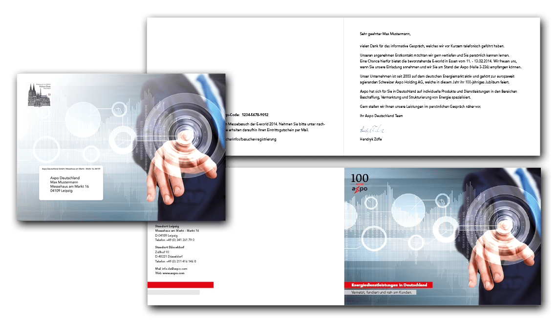 Zur direkten Ansprache von Kundengruppen unterstützen wir Axpo mit diversen Direktmarketing Aktionen wie z.B. personalisierten mehrstufigen Postmailings (inkl. Konzeption, Text, Layout, Lettershop-Optimierung der Adressdatensätze, Produktion und Postversand)